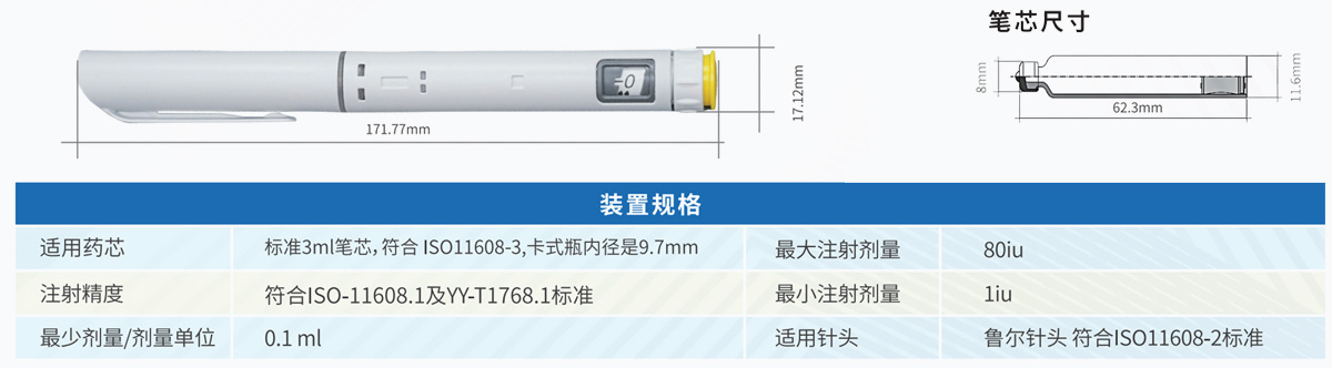 精准给药:微调刻度,确保剂量准确可靠,提升药物治疗效果,注射剂量 精度完全符合国际ISO-11608.1及YY-T1768.1技术要求及标准。装配便捷:减少组装步骤,充分考虑药企自动终装线设备需求,提高生产效率。多药兼容:支持胰岛素、GLP-1、抗生素、生长素、干扰素、等多种药物,满足药企多样化需求。